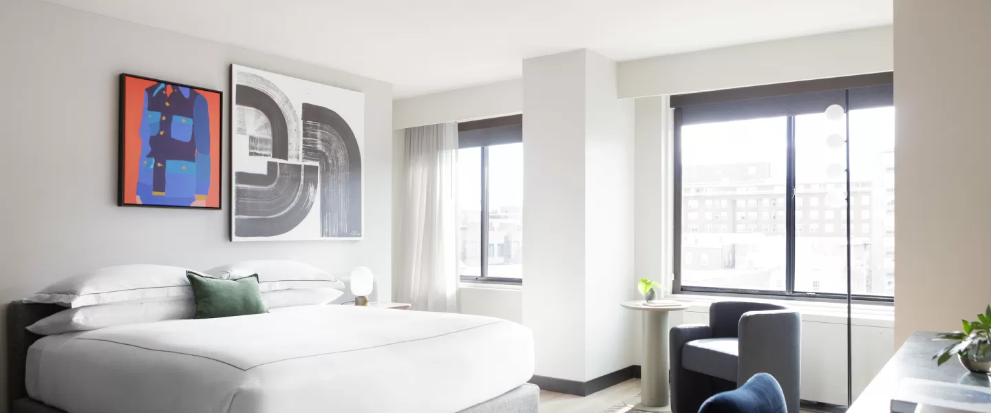 Kimpton Banneker Hotel has one of the most enviable addresses in the District, on a tree-lined avenue with a view straight down 16th Street NW of the White House. Standouts include the sophisticated design, a blend of cool minimalism and warm tones, and the dining options: a ground-floor French bistro that buzzes day and night. An inviting year-round rooftop with the most stunning views of DC's monuments can be booked for private events. Equal parts chic apartment and high-end art gallery, each of the Kimpton Banneker Hotel’s oversized guest rooms features a curated collection of abstract art, luxurious Frette linens, a well-equipped workspace, and gorgeous materials that keep comfort in mind.