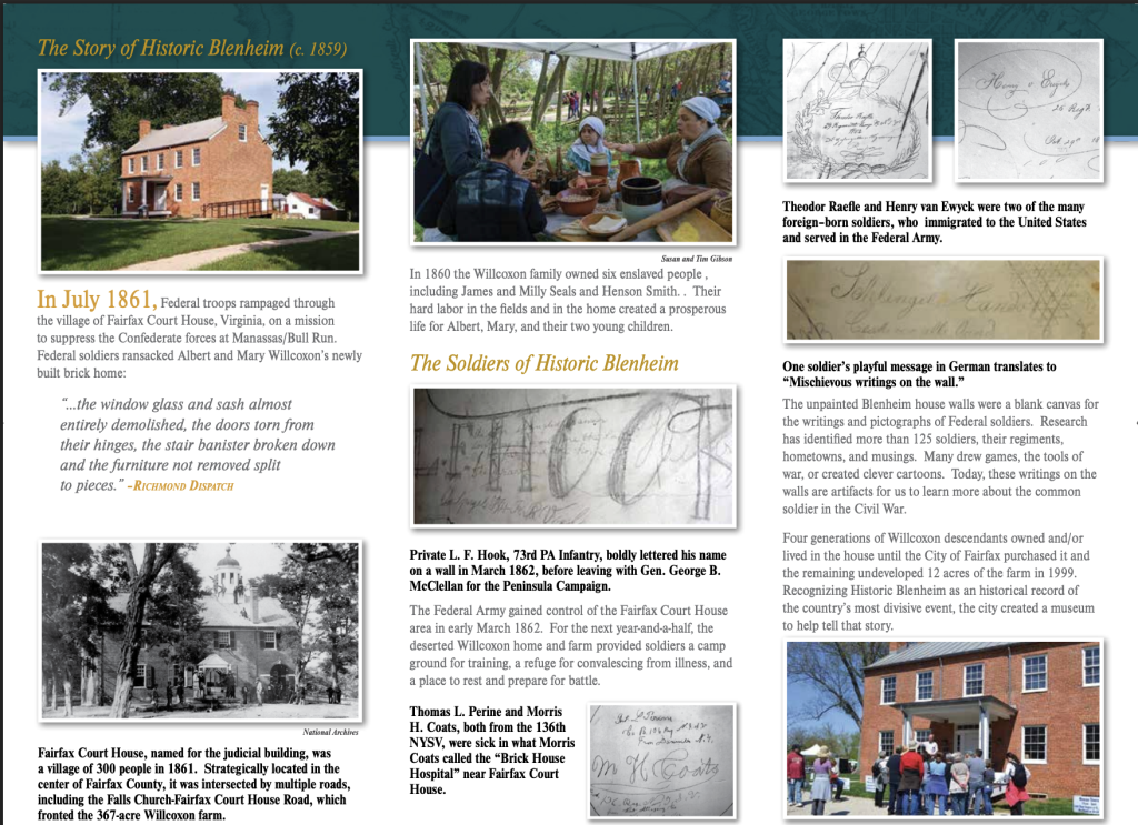 Exhibits, and the daily guided tour of the Historic Blenheim house, focus on the impact of war in the area, the family, and enslaved residents of Blenheim, and the Union soldiers that left their mark as they traveled through Fairfax Courthouse. Multimedia in our large viewing room shows specific features of the house’s walls.