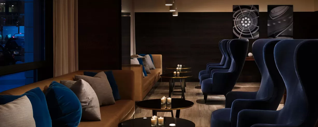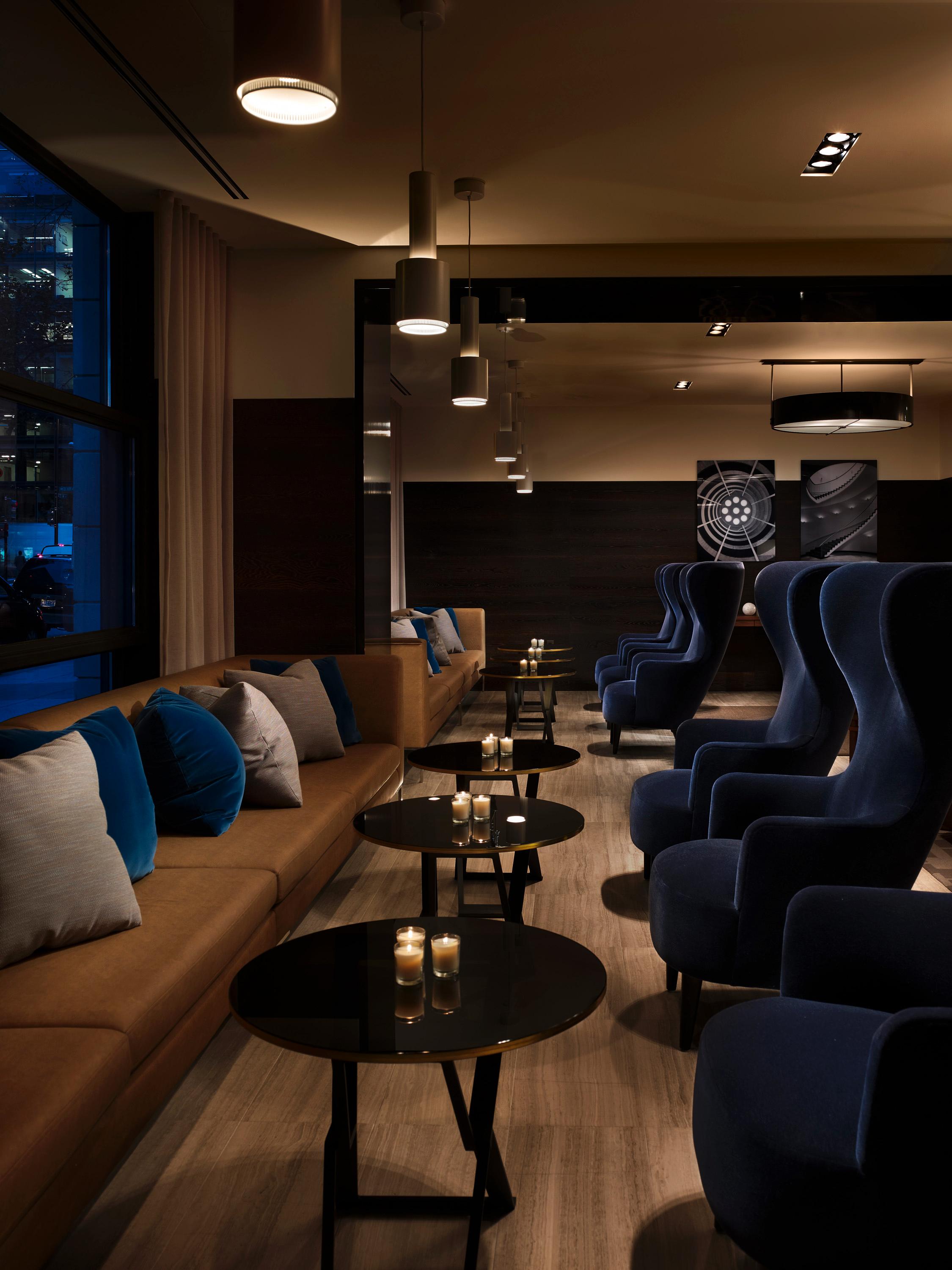 A lounge is approximately 4,000 square feet of luxurious, open flow amenity spaces, including a stunning bar and fireplace, and contemporary, comfortable seating with open views onto the street scape.