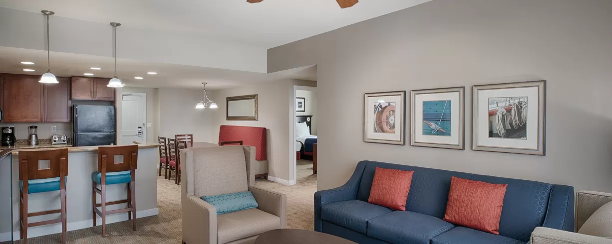 Offering spacious one-, two- and three-bedroom resort suites that comfortably sleep four to ten guests and range from 723 to 1,296 square feet. Suites feature private bedrooms with one king bed in the master, one king or two double beds in the guest rooms and a queen sleeper sofa in the living area. You will appreciate the economy of a fully equipped kitchen, separate living/dining areas and convenient comforts available in select suites, including a whirlpool tub and a private balcony.