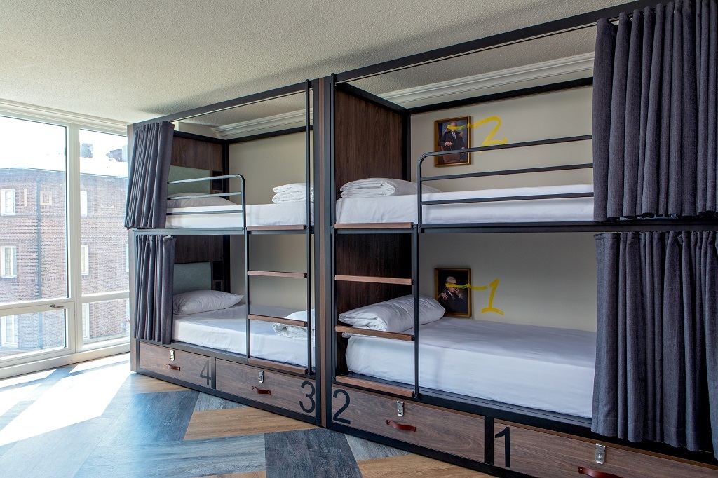 Generator Washington DC Hotel features 3 room types: 1 King Bed, 2 Twin Beds, or 4 Bunk Beds.
