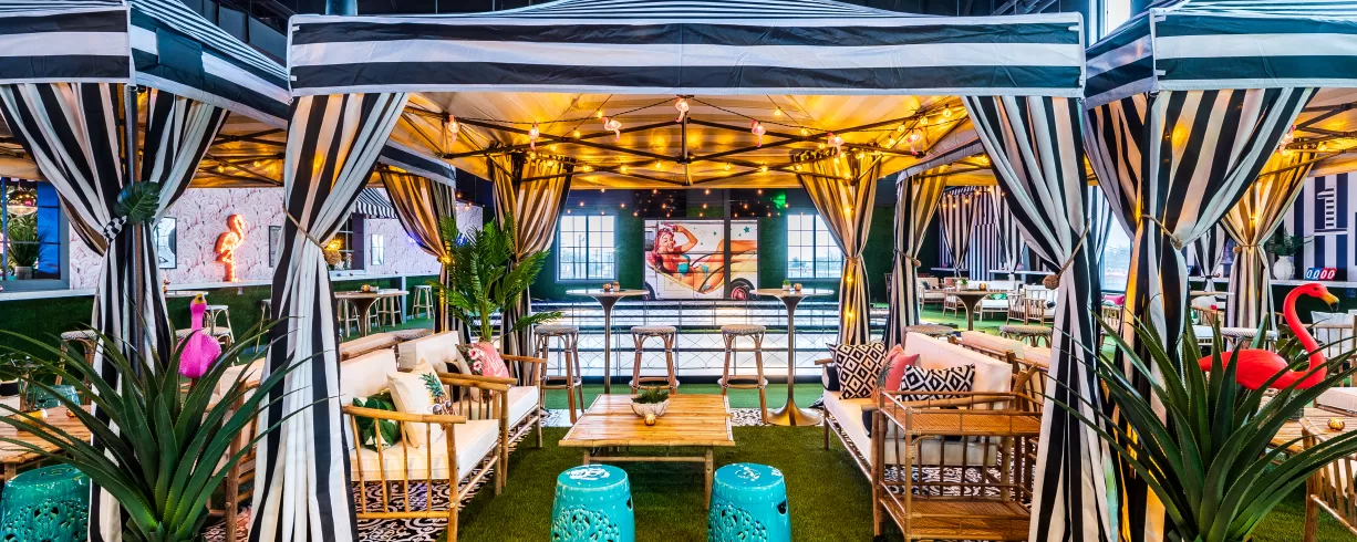 Flamingle upstairs at THRōW Social in an easy, breezy tropical atmosphere. Sip on specialty cocktails, indulge in mouthwatering food, and enjoy live DJs all day (or night!) long. Rent a VIP Cabana, play backyard-style games like corn hole & light-up ping-pong, then dance the night away!