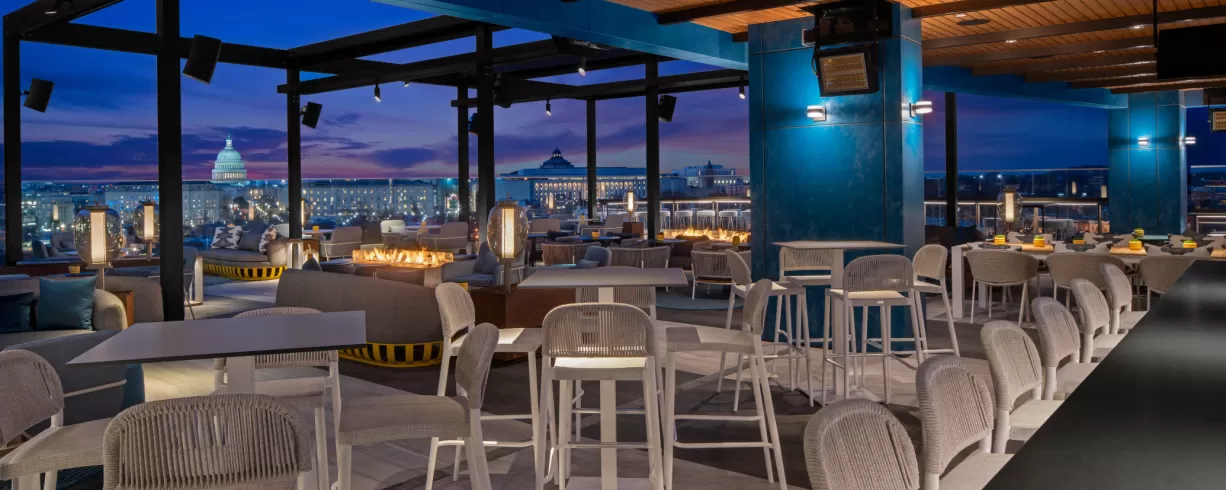 Smoking Mirrors and Skybar, Located on the 11th Floor. Has a Retractable Roof, perfect for any season and with Direct Views of the US Capitol Building